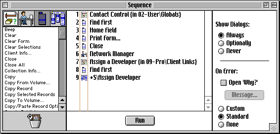 The status of the option key (for purposes of determining whether a sequence should optionally show dialogs) was previously tested only at the very beginning of the sequence execution. If the option key was held down when the sequence began, it was treated as ‘always down’ through the entire sequence chain. This behavior is unchanged. With this fix, the option key is retested at the beginning of each nested or conditional sequence. If the option key is not held down when the main sequence begins, but is held down when a nested/conditional sequence begins, optional dialogs will be shown during the running of that nested/conditional sequence. The optional status returns to the default (based on the status of the option key when the main sequence was initiated) when the nested/conditional sequence ends. This change enables you to enable the optional attribute only when necessary. For example, a sequence that exports data from a series of views is typically set to optionally show dialogs so the collection designer can preload the views with the required file names. If this sequence is built as a single long sequence that includes the ‘Export’ and ‘Close Window’ commands repeatedly, holding the option key down at the beginning requires the designer to respond to the export dialog box for every view in the sequence. However, by building this sequence as a separate sequence containing only the ‘Export’ and ‘Close Window’ commands, and then nesting that sequence in the main sequence, the designer can bypass the export dialog boxes for views that are already set, accessing only those that need work. |